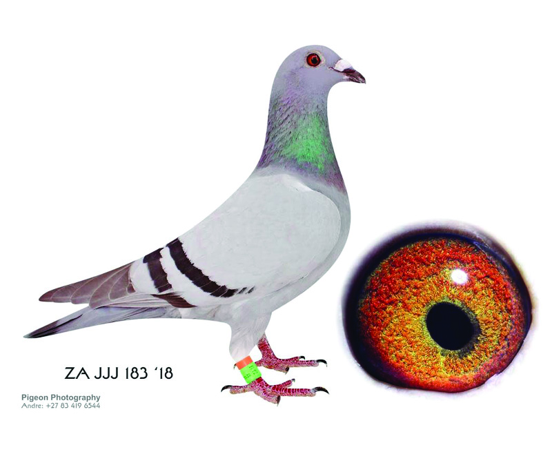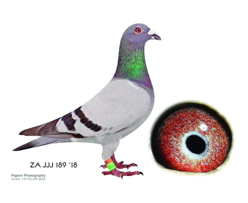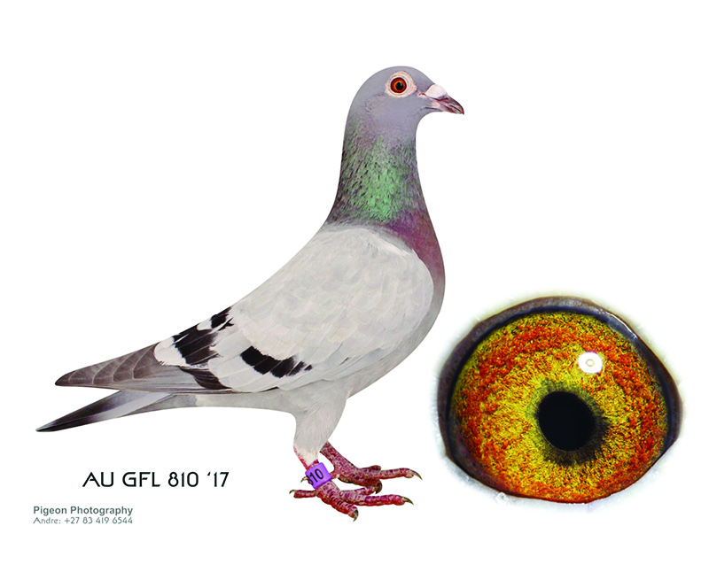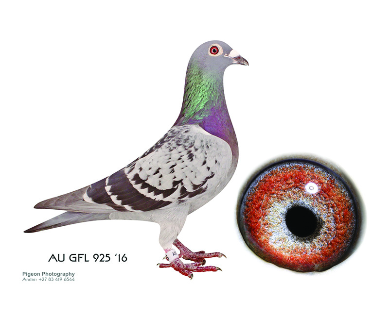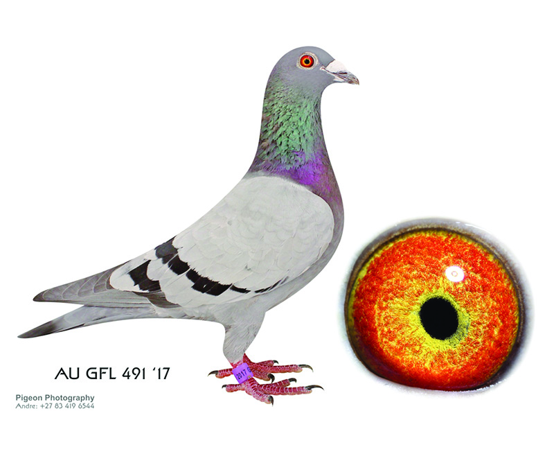 AU GFL 491 17 Cock won prizes 213, 518, 574 & 678 and 516 in the South African Million Dollar Pigeon Race final, son of Sherma a super breeder and son of Zorro’s Dream full sister to Wolverine and has grossed over 370 000, 00 dollars. From the Mona Lisa, Rocket and Wolverine bloodline.