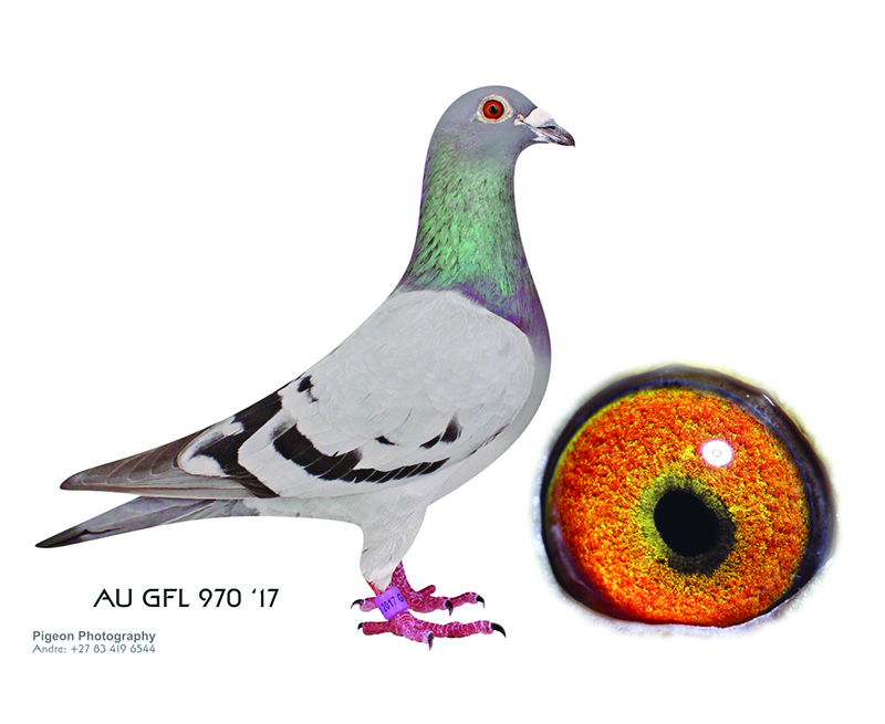 AU GFL 970 17 Cock from the Wolverine Sorrento Bloodline son of Silver Streak who is the strongest and a favorite male, son of Sophia who is a daughter of Sun City 1st prize in the South African Million Dollar Pigeon Race, son of Super Hen.